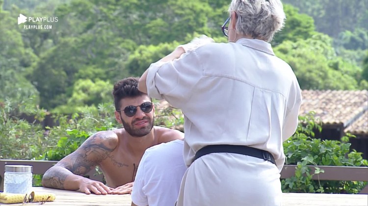 Andréa Nóbrega virou a cabeleireira do confinamento. Na tarde desta sesta-feira (1º), a peoa retocou a cor do cabelo de Viny. 'Supla agradece', brincou o humorista com o cabelo tingido de loiro quase branco.