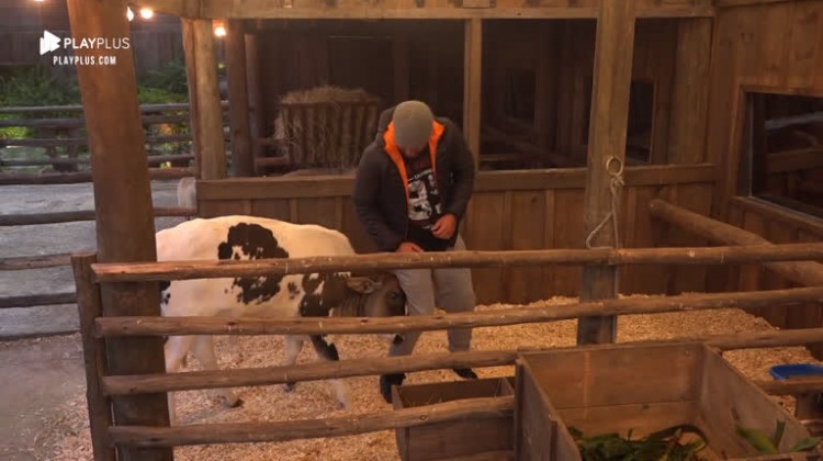 No final da tarde desta segunda-feira (2), Rodrigo Phavanello se divertiu com o bezerro Chiquinho. O peão foi até o estábulo da sede e brincou de levar cabeçada do filhote.