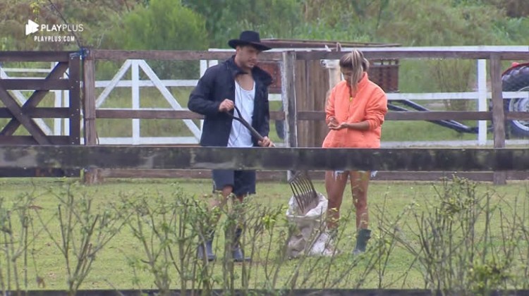 Hariany Almeida perguntou para Lucas Viana se poderia dar um pedaço de comida que caiu no chão para os animais e o peão criticou a namorada: