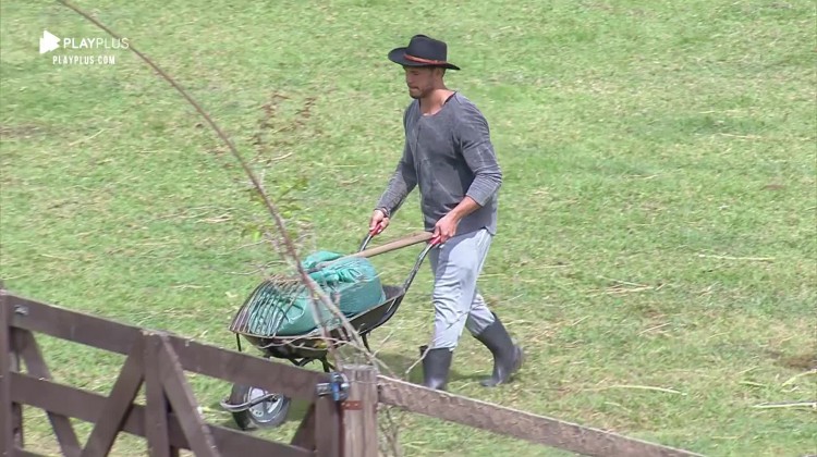 Os peões acordam cedo para realizar as tarefas obrigatórias do confinamento. Lucas Viana, por exemplo, cuidou da área externa da sede.