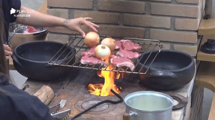 Os peões começaram a segunda-feira (18) com vontade de comer churrasco. Para isso, eles improvisaram bifes de picanha e cebolas no fogão a lenha da cozinha.