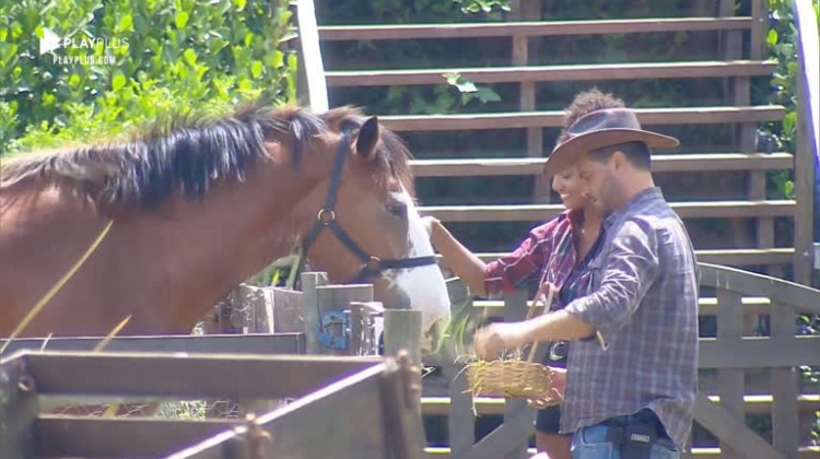 Rodrigo Phavanello e Sabrina Paiva brincaram com o cavalo Lyon, na manhã desta segunda-feira (25). O casal 'conversou' e alimentou o animal.