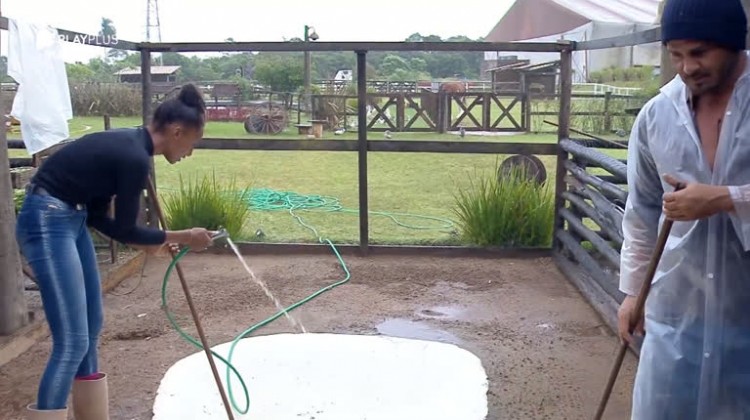 Nem o tempo ruim atrapalhou as atividades dos peões, na manhã desta quinta-feira (28). Rodrigo Phavanello e Sabrina Paiva, por exemplo, limparam o laguinho do galinheiro.