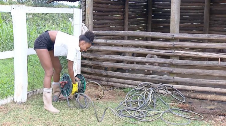 Sabrina Paiva cuidou do chiqueiro, na manhã desta terça-feira (3). Porém, a peoa se atrapalhou com a mangueira e Rodrigo ajudou a namorada.