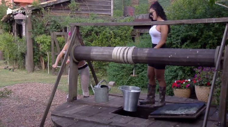 As peoas estavam enchendo os baldes no poço e Aline aproveitou para brincar com a amiga