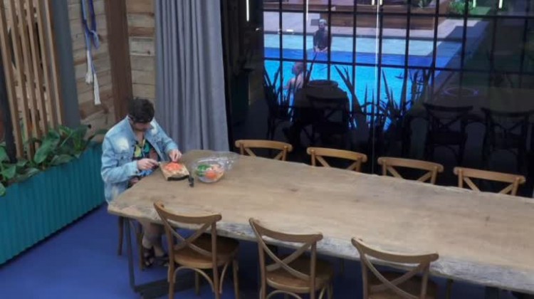 Humorista corta os legumes enquanto alguns participantes aproveitam a piscina