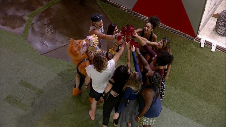 Tudo começou com uma chamada inesperada. Aniversariante deste domingo, Gabriela doi até a a despensa e deu de cara com um baldinho cheio de bebidas. Se empolgou tanto que saiu de lá sem perceber também tinha um cooler! Ela logo correu para a varanda, onde estava conversando com Alan, Rízia e Alberto Mezzetti, o "Tarzan" italiano.