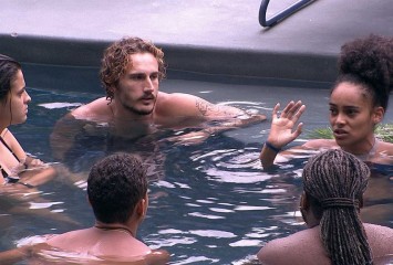Ainda na piscina, alguns confinados conversam e Gabriela começa a falar sobre uma possível votaç...
