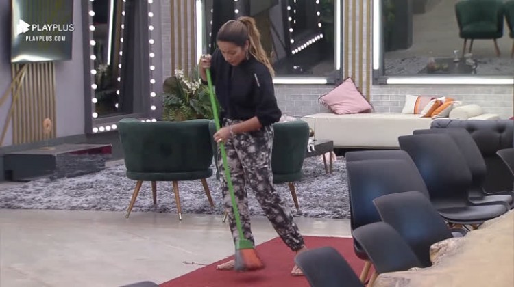 Dupla conversa com Leandro e Matheus enquanto realiza a limpeza do cômodo