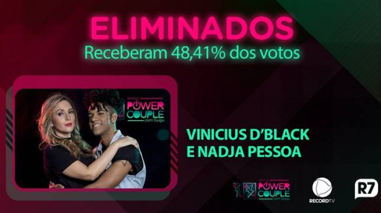 Fim de jogo para Vinicius D’Black e Nadja! Com 48,41% dos votos, eles foram eliminados do Power Couple Brasil, no programa desta terça-feira (5). O casal foi para a DR depois de ficar em último lugar na Prova dos Casais e enfrentou Tati Minerato e Marcelo. Eles deixaram o reality show após a votação popular no Portal R7.